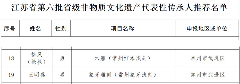 近日,江苏省文化和旅游厅发布《关于江苏省第六批省级非物质文化遗产代表性传承人的公示》,我校两位教师徐风、王明盛成功入选,分别被授予“木雕(常州红木浅刻)”和“象牙雕刻(常州象牙浅刻)”项目的省级非物质文化遗产代表性传承人。这是我校在文化传承创新领域取得的又一重要成果,彰显了学校在非遗保护与人才培养方面的深厚底蕴与社会贡献。